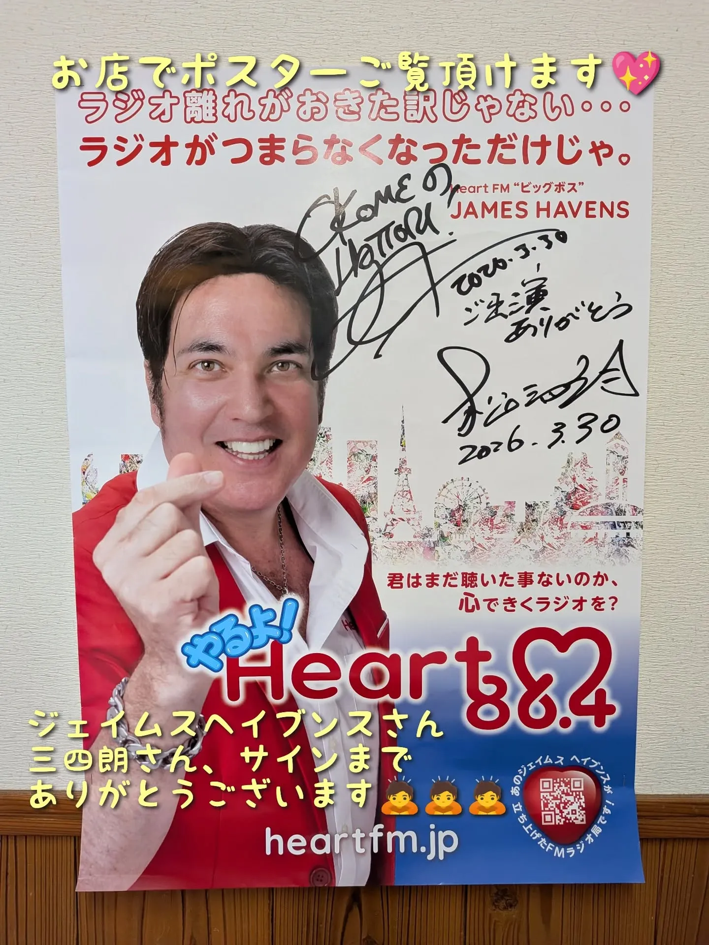 ひぇーっ🙀 2026/04/02 ひぇーっ🙀 偶然ジェイムスさんに、会えたから⁉️ 従業員の熱烈アピールから⁉️ ポスターにサインまで 頂いてしまいました🎉🎉🎉 お店でドーンと飾ってあります‼️ #お米の服部 #昭和区 #heartfm #ジェイムスヘイブンス #松山三四朗