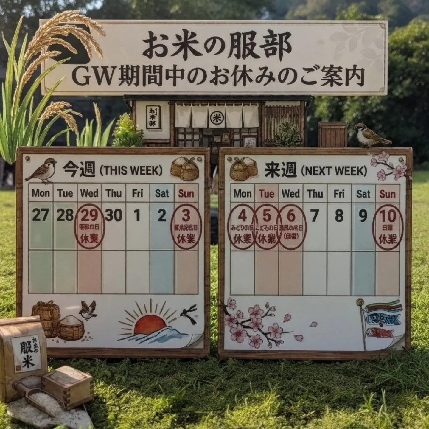 GWのお休みについて 2026/04/27 GWのお休みについて よくお問い合わせ頂くので 作成しました🗓️ お米の服部では、 いつも通りですが 日曜と祝日のみお休み頂きます🙇 よろしくお願い致します😊 #お米の服部 #昭和区 #ゴールデンウィーク #お休みのお知らせ #米屋